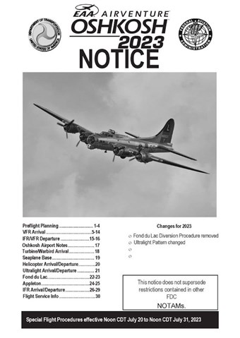 The FAA has released the EAA AirVenture Oshkosh 2023 Notice (formerly called the NOTAM) featuring arrival and departure procedures for for EAA's annual fly-in convention to be held July 24-30 at Wittman Regional Airport (KOSH) in Oshkosh, WI.