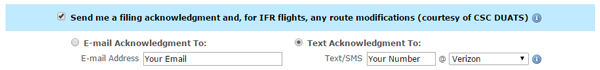 This enhancement, made possible by CSC DUATS, is available to all iFlightPlanner members regardless of one's membership type! Simply check the appropriate box on the flight plan filing screen in iFlightPlanner for iPad or iFlightPlanner.com (shown) and messages will be sent via email or text accordingly.