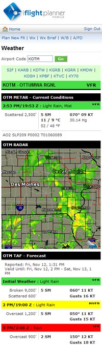 Click "Wx" at the top of any iFlightPlanner Mobile page, then enter your airport code or click on any of your favorites